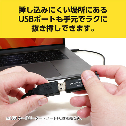 USBメモリなどを接続したときに隣の機器の邪魔になりにくいケーブルタイプ。