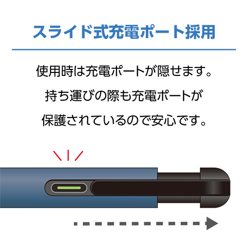 スライド式充電ポート採用。使用時は充電ポートが隠せてスマートにご使用いただけます。持ち運びの際も充電ポートが保護されているので安心です。