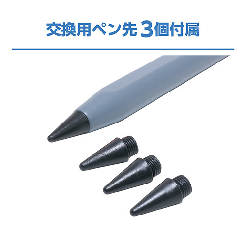 ペン先は交換可能。本体に1個取付済みで、交換用のペン先が3個付属しています。また、ペン先がやわらかいPOM素材なので画面などをキズが付けにくく安心です。ペン先のみを弊社HPからご購入いただくことも可能です。