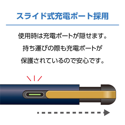 スライド式充電ポート採用。使用時は充電ポートが隠せてスマートにご使用いただけます。持ち運びの際も充電ポートが保護されているので安心です。
