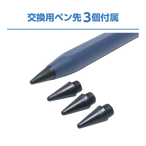 ペン先は交換可能。本体に1個取付済みで、交換用のペン先が3個付属しています。また、ペン先がやわらかいPOM素材なので画面などをキズが付けにくく安心です。ペン先のみを弊社HPからご購入いただくことも可能です。