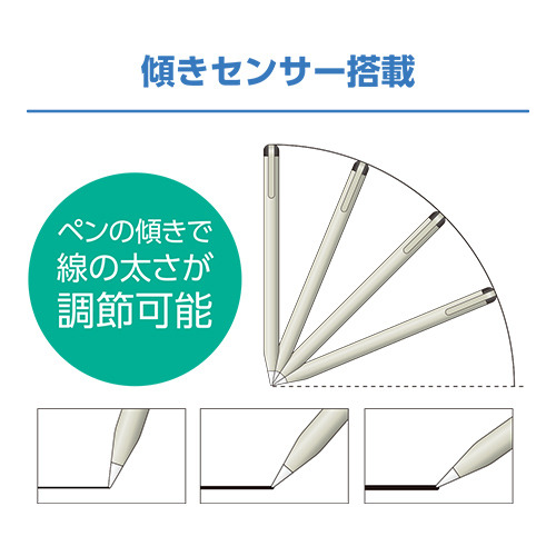4段階の傾きセンサー搭載で、ペンの角度に合わせて線の太さが変わります。