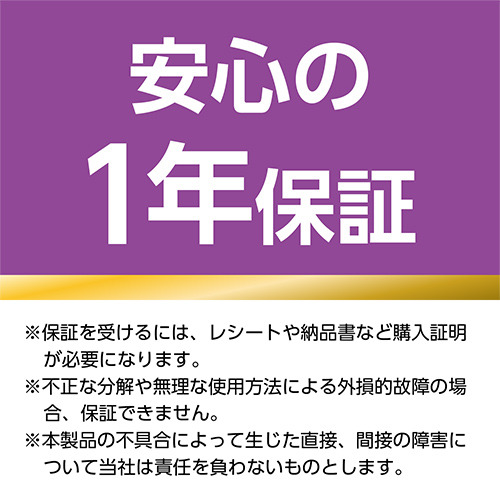 購入から1年間、本製品に不具合が発生した場合交換します。※保証を受けるには、レシートや納品書など購入証明が必要になります。※不正な分解や無理な使用方法による外損的故障の場合、保証できません。※本製品の不具合によって生じた直接、間接の障害について当社は責任を負わないものとします。