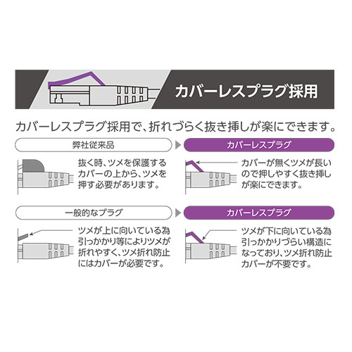 カバーが無くツメが長いので押しやすく抜き挿しが楽にできるカバーレスプラグ採用。ツメが下に向いている為引っかかりづらい構造になっており、ツメ折れ防止カバーが不要です。カバーの上からではなく直にツメが押せるので、押しやすく抜き挿しも楽々です。