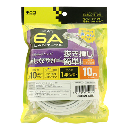 ミヨシ C6A-N100WH カテゴリー6A 抜きやすい LANケーブル 10m 白 C6AN100WH