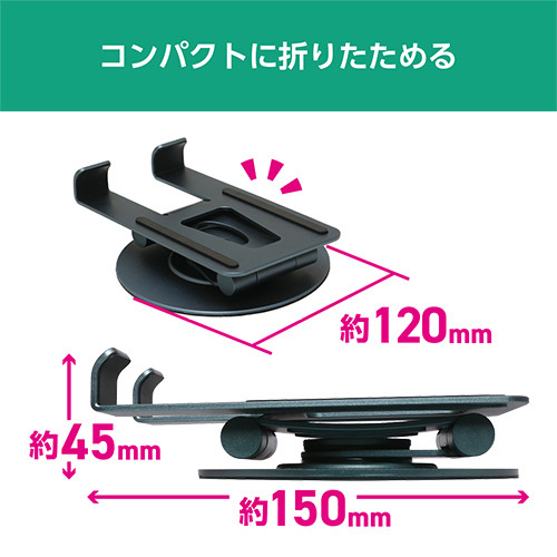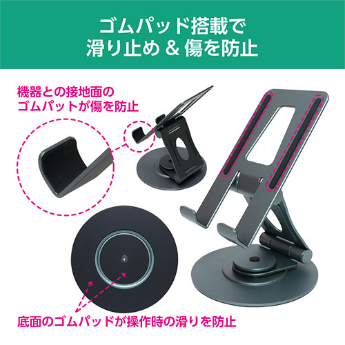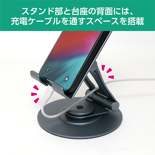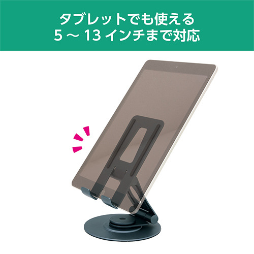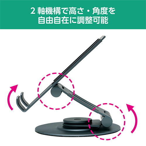 スマートフォンやタブレットの角度、高さを調整できる2軸機構を採用。動画閲覧やWeb会議など様々な用途に合わせて最適な角度で使えます。折りたたみ可能でコンパクトに収納もできます。