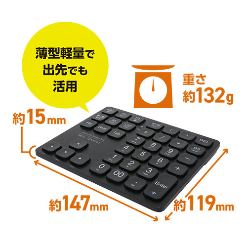 動作時間:最大約145時間(連続入力時)※最大使用時間は連続使用時の計算値です。通信距離、使用キーなどにより大きく変動します。