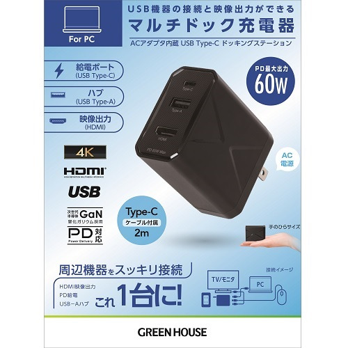 グリーンハウス GH-ACU3PA-BK マルチドック充電器 USB Type-A/C/HDMI搭載 高出力 PD 60W対応 ブラック