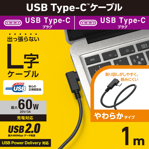 ●最大60WのUSB Power Deliveryに対応したUSB Type-C(TM)ケーブルです。束ねてもクセが残りにくいやわらかケーブルと、飛び出しが少ないスッキリした配線が可能なL字コネクターを採用しています。USB Type-C(TM)ポートを搭載しているパソコンおよび充電器・モバイルバッテリーなどに、USB Type-C(TM)ポートを搭載しているスマートフォンやタブレットを接続し、充電やデータ転送ができます。