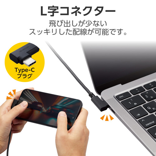 ●L字コネクターを採用し、飛び出しが少ないスッキリした配線が可能なUSB Type-C(TM)ケーブルです。