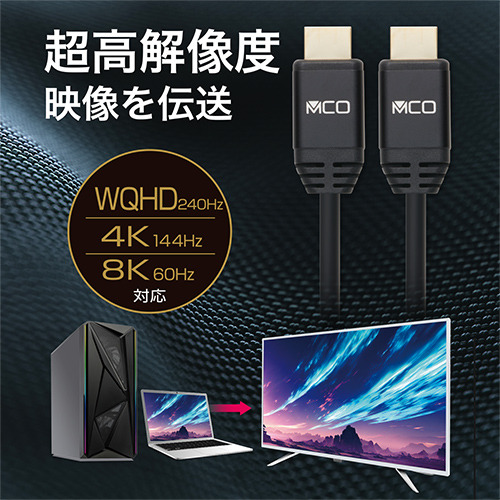 PCとモニターを接続して、映像と音声をの伝送を行うHDIMケーブルです。ゲーミングモニターとの接続に最適な高解像度/高リフレッシュレートに対応しています。