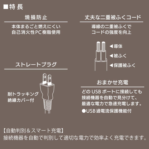 ●USB充電ポート×2ポート搭載、合計出力2.4A