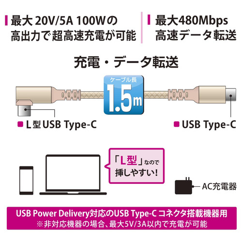 USB Power Delivery対応のUSB Type-Cコネクタ搭載機器用:※非対応機種の場合、最大5V/3A以内で充電が可能",",",",",オーム電機 SMT-L15LTCC-N 断線に強いTypeCケーブル PD対応 L型 1.5m