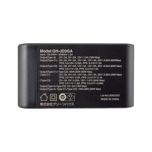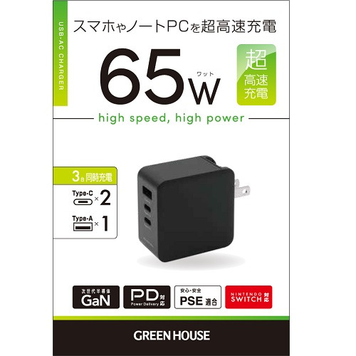 グリーンハウス GH-JD3GA-BK AC充電器 USB 3ポート 65W USB Power Delivery対応 GaN採用 ブラック