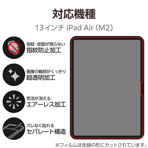 ●気泡が目立たなくなるエアーレスタイプ。液晶画面を傷や汚れから守る、指紋防止・超透明タイプの13インチiPad Air(M2)用液晶保護フィルムです。