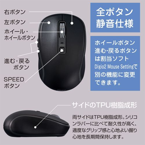 当社ホームページからダウンロードできるマウス割当てソフト【Digio2 Mouse Setting】を利用すればホイール・進む・戻るボタンを他の機能に変更することができます。変更できる設定(一例)・全て選択・コピー・切り取り・貼り付け・デスクトップ・元に戻す・音量調節 Windows11、10 macOS10.15以降対応 ※他OS非対応