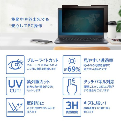 フィルタ内部のルーバーが画面の発光方向を正面にコントロール。ブラインド効果で正面からはハッキリ、横から見ると画面は真っ黒に見え、のぞき見を防止します。
