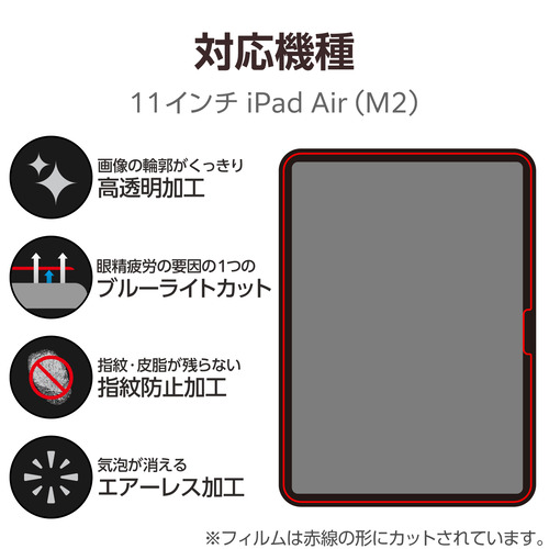 ●画面を見続ける機会が多い現代人の目を考えて開発。画面が発する光の中の青い部分「ブルーライト」を大幅にカットする、11インチiPad Air(M2)用の高透明タイプの画面保護フィルムです。