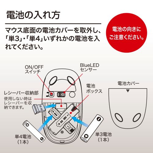 使用電源:単3乾電池1本もしくは単4乾電池1本(マウス本体側)