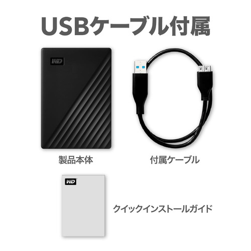 付属品:USB 3.0ケーブル(長さ:46cm、コネクタ形状:Micro B-A)、WD Discoveryソフトウェア、クイックインストールガイド