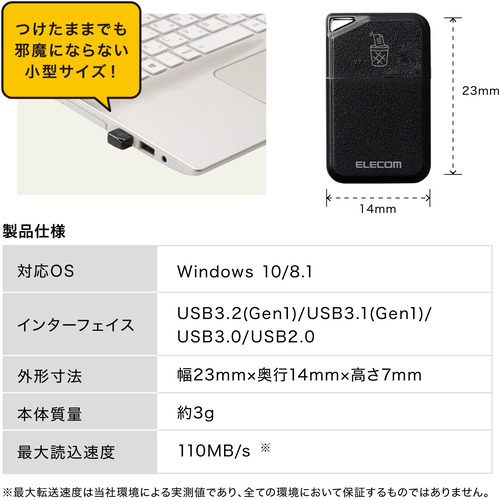 ●USB3.2(Gen1)対応で、読込速度110MB/sの超高速データ転送を実現するUSBメモリです。