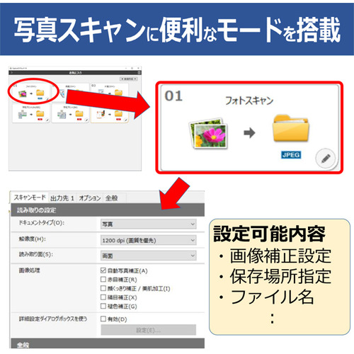 はがき見開きモード搭載により、表面/裏面を見開きに繋げて保存できます