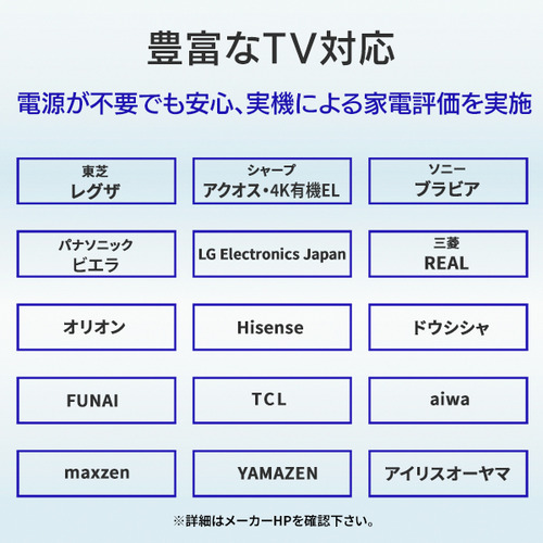 家電メーカーと連携し、さらに実機での動作確認を実施しています。「電源がないと動作が不安定になるのでは…」という心配も不要。きちんと動作確認済みですので、安心してお使いいただけます。