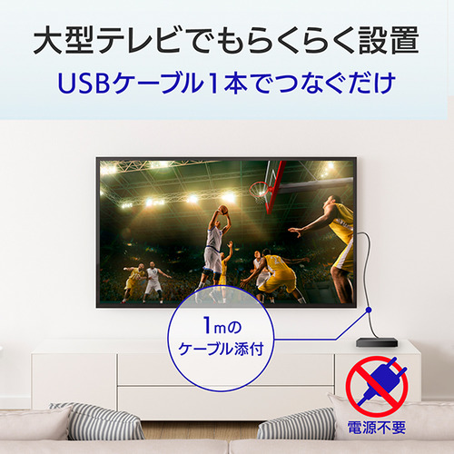 テレビとの接続はとても簡単!パッケージに同梱しているUSBケーブルを使って、テレビと本商品をつなぐだけ。