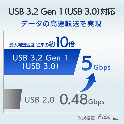 従来USB 2.0の最大転送速度480Mbps(規格値)の約10倍以上です。
