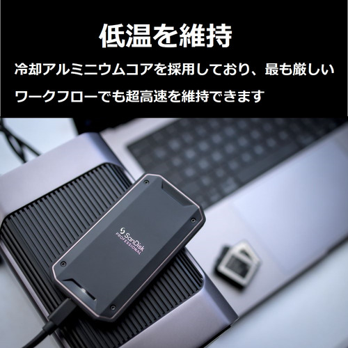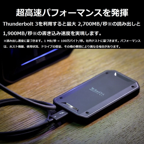 Thunderbolt 3 (40Gbps)とUSB-C (10Gbps)の2つの接続モードに対応。Thunderbolt 3接続時は最大2700MB/sの読み出し速度と最大1900MB/sの書き込み速度。高解像度な画像や映像の編集作業時の仮想記憶ディスクとして最適。IP68に準拠、優れた防塵防水性能。最大3mからの落下試験と4000ポンド(約1800kg)の耐衝撃試験をクリアする堅牢性