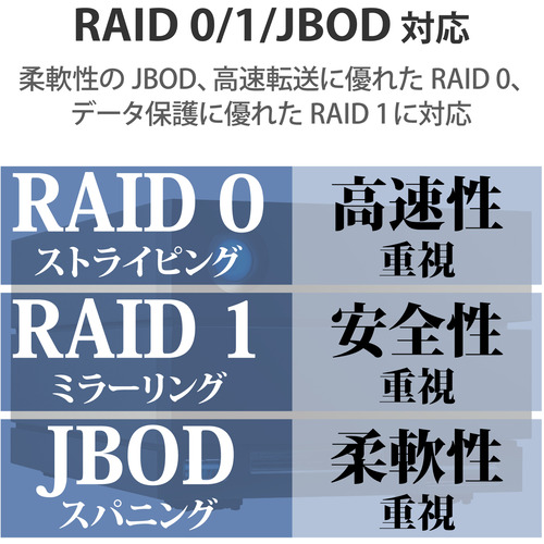 ●HDDを2台内蔵したRAID0(ストライピング)機能により、より高速なデータ転送が可能です。また、RAID1(ミラーリング)機能を選択することで、高い信頼性を確保することも可能です。