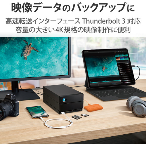 ●Thunderbolt 3に対応し、実測550MB/sという超高速転送を実現します。容量の大きい4K規格の映像転送に最適です。またThunderbolt 3ケーブルを1本同梱しており、別途ご購入いただく必要がありません。
