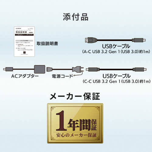付属品:ACアダプター、電源コード(PSE適合品)、USBケーブル(A-C USB 3.2 Gen1(USB 3.0)約1m)、USBケーブル(C-C USB 3.2 Gen1(USB 3.0)約1m)、取扱説明書