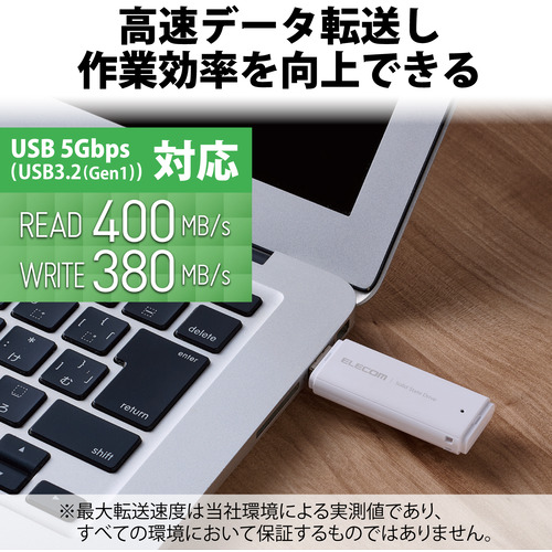 データ転送速度:読み込み:最大400MB/s、書き込み:最大380MB/s ※USB 5Gbps(USB3.2(Gen1))でご使用になるには、機器側がUSB 5Gbps(USB3.2(Gen1))に対応している必要があります。