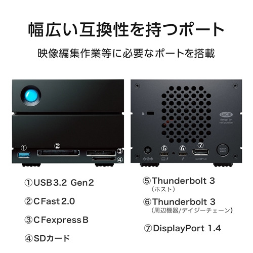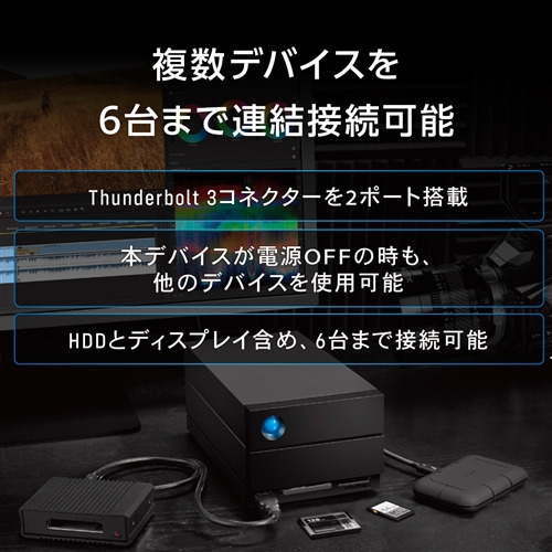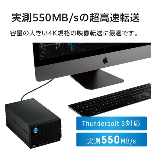 ●Thunderbolt 3に対応した外付けHDDです。USB3.2(Gen2)の約4倍の40Gbps(理論値)の高速転送と、RAIDの設定(0,1)が可能なので、大容量の映像データの編集やバックアップ用途に最適です。冷却用ファン搭載により信頼性が大きく向上しました。LaCieで互換性トップクラスのHDDです。