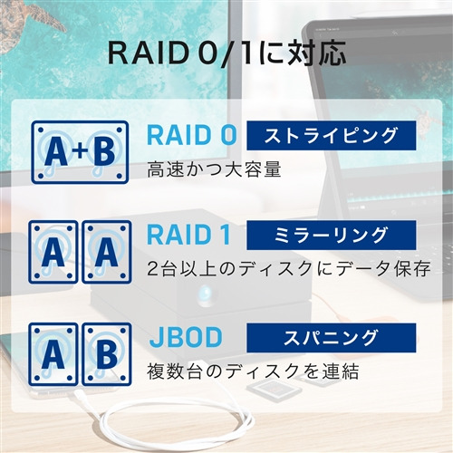 ●HDDを2台内蔵したRAID0(ストライピング)機能により、より高速なデータ転送が可能です。また、RAID1(ミラーリング)機能を選択することで、高い信頼性を確保することも可能です。