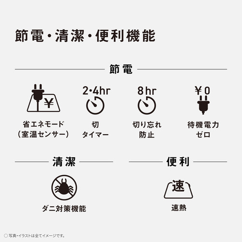 特長:速熱、切り忘れ防止(8時間)、2H・4H切タイマー、室温センサー、ダニ対策、折り可(8折)、ヤグラ可、省エネスイッチ