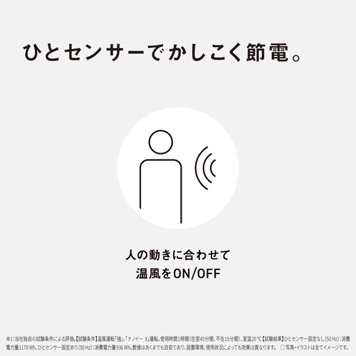 スイッチの種類:電源スイッチ(切/入)、温風(強・弱)、切タイマー(1・2・3時間後切)、人センサー(切/入)