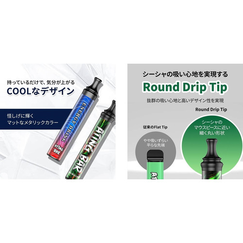 【新型マウスピース、Round Dip Tip搭載】:先端が細く丸い形のマウスピースで、シーシャと同じような吸い心地を実現しています。フラットで大きなマウスピースと比べ、吸いやすさ・デザイン性ともに優れています。また、両端をシリコンキャップでしっかりと密閉するため、リキッドの蒸発を防止し、長く楽しむことができます。