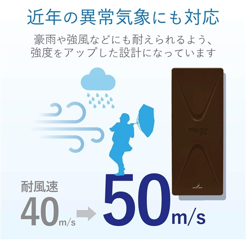 近年の豪雨や強風などの異常気象にも耐えられるよう、耐風速を40m/s(従来品)から50m/sに強度アップ。 【仕様】