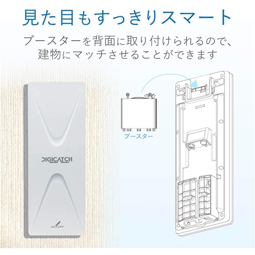 平面アンテナの背面にブースターが取付けできる新構造により、スッキリきれいな設置が可能。