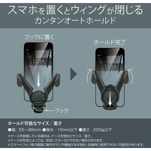 ●スマートフォンの重さに連動して左右のウィングが連動して閉じる構造を採用