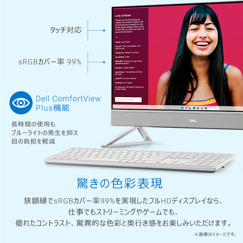 狭額縁でsRGB 99%を実現したフルHDディスプレイにより、仕事、ストリーミング、ゲームで優れたコントラスト、驚異的な色彩、奥行きをお楽しみいただけます。また、ディスプレイは、ブルーライトの発生を抑えるDell ComfortView Plus機能を搭載し、フリッカー防止パネルを採用しているため、目の負担を軽減できます。