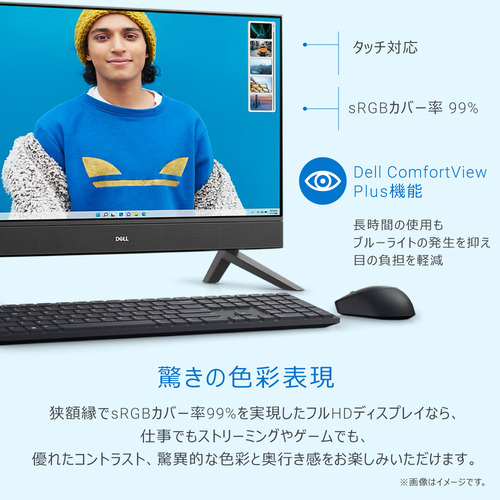 狭額縁でsRGB 99%を実現したフルHDディスプレイにより、仕事、ストリーミング、ゲームで優れたコントラスト、驚異的な色彩、奥行きをお楽しみいただけます。また、ディスプレイは、ブルーライトの発生を抑えるDell ComfortView Plus機能を搭載し、フリッカー防止パネルを採用しているため、目の負担を軽減できます。