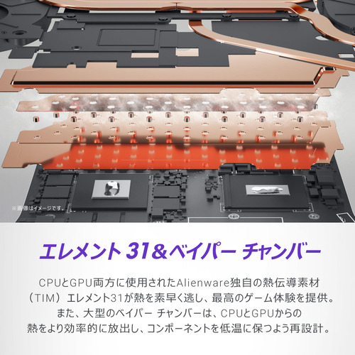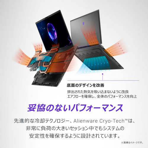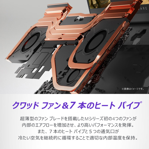 先進的な冷却テクノロジー、Alienware Cryo-Techは、非常に負荷の大きいセッション中でもシステムの安定性を確保するように設計されています。超薄型のファン ブレードを搭載したMシリーズ初のクアッドファンは内部のエアフローを増加させ、より高いパフォーマンスを発揮します。また、7本のヒート パイプと5つの通気口が冷たい空気を継続的に循環することで適切な内部温度を保持します。