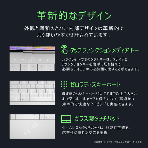 [ゼロラティス キーボード]ほぼ縁のないキーボードは大きく深いキーキャップを備え、高速かつ効率的なタッチ入力を実現します。