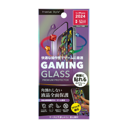PGA PG-24AGLF07GM iPhone 16/15用 液晶全面保護ガラス 角割れ防止PETフレーム [ゲーム特化/指紋・反射防止] Premium Style