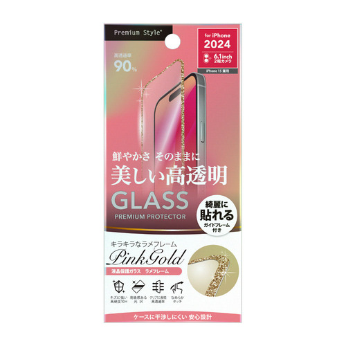 PGA PG-24AGLL03PK iPhone 16/15用 液晶全面保護ガラス ラメフレーム [ピンクゴールド/高透明] Premium Style