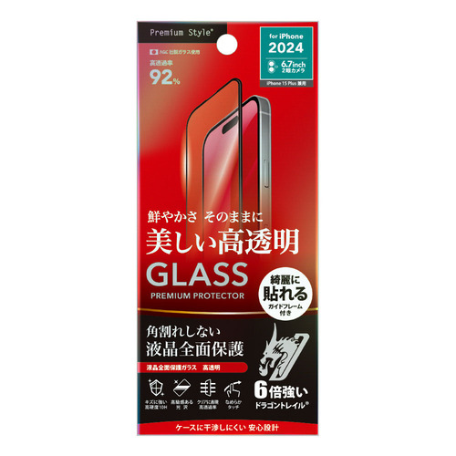 PGA PG-24CGLF01CL iPhone 16 Plus/15 Plus用 液晶全面保護ガラス 角割れ防止PETフレーム Dragontrail [高透明] Premium Style