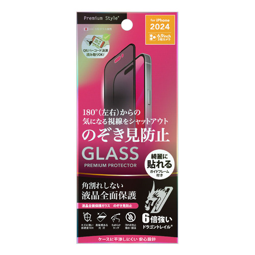 PGA PG-24DGLF03MB iPhone16 Pro Max用 液晶全面保護ガラス 角割れ防止PETフレーム Dragontrail Premium Style 覗き見防止/高光沢